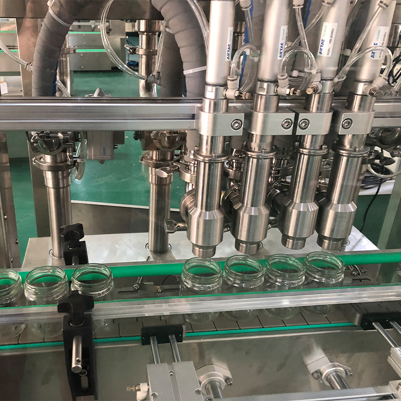 4、定量灌裝:灌裝頭通過預設的(de)灌裝量,將辣椒醬精準注入在瓶中,灌裝過程采用伺服(fú)係統,確保灌裝量的精(jīng)準和穩定。